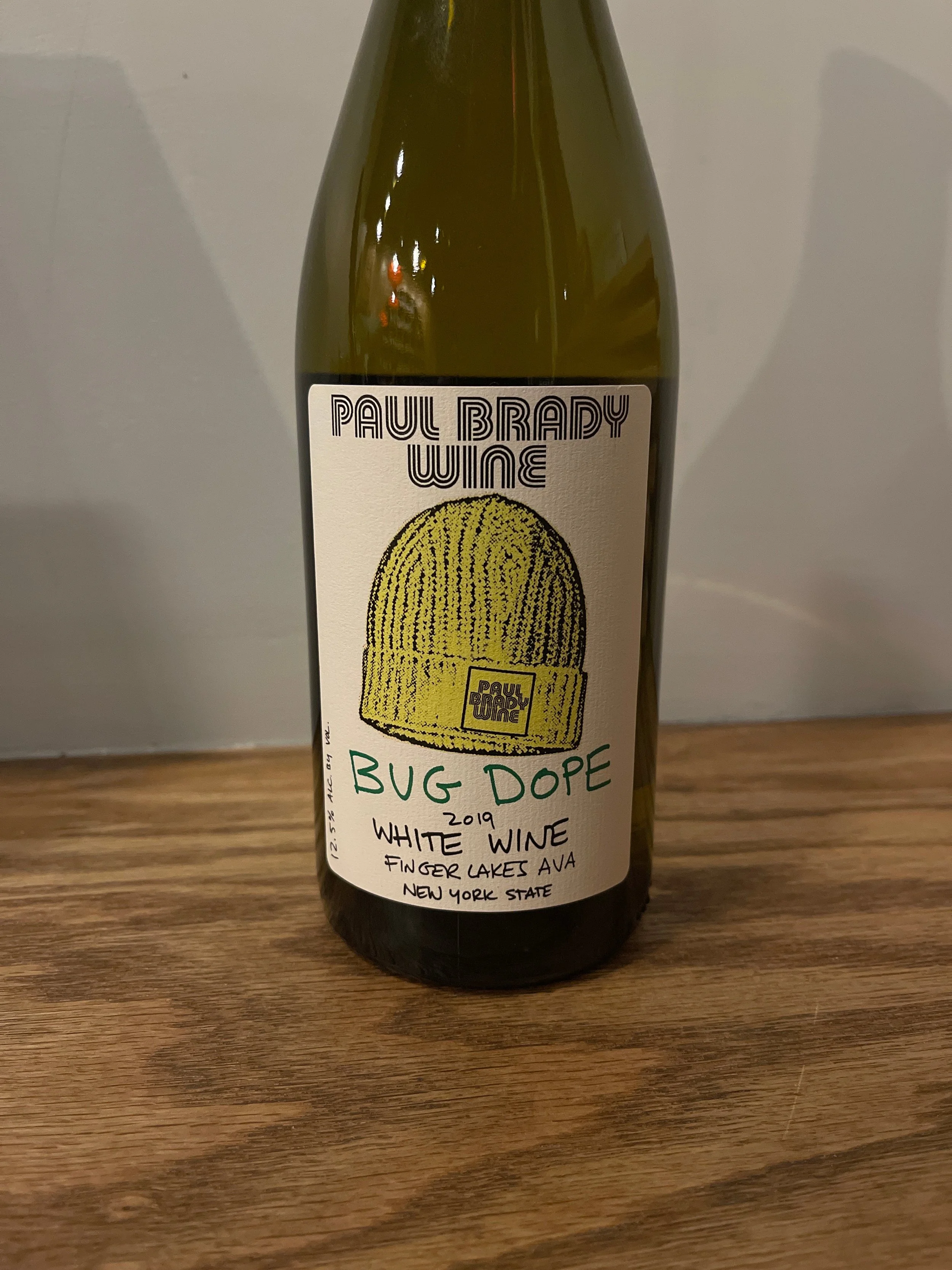 • A wine bottle with a custom label reading 'Bug Dope' and 'Paul Brady Wine 2023'. The label features a yellow knit hat illustration and details about the wine's origin in Finger Lakes, New York, with 11.5% alcohol. The bottle is placed on a light-colored surface with a brick wall background, casting shadows.
